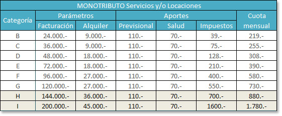 Las categorías H e I son comunes para locaciones y prestaciones de servicios y para el resto de las actividades, y corresponden a los topes de ingresos anuales de $ 144.000 y $ 200.000, respectivamente, mientras que para el resto de los negocios las escalas llegan hasta $ 300.000.
