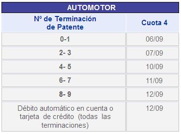 Entre los próximos vencimientos de impuestos en el Calendario 2012, desde la Agencia de Recaudación de la provincia de Buenos Aires (ARBA) comunica que entre los días 6 y el 12 de Septiembre de 2012 vencerá el plazo para que paguen la cuota 4 del Impuesto Automotor. Así todos aquellos que se encuentren adheridos al sistema de débito automático en su cuenta bancaria o tarjeta de crédito, y no teniendo en cuenta el número de patente, el vencimiento será el 12 de Septiembre en dichos casos.